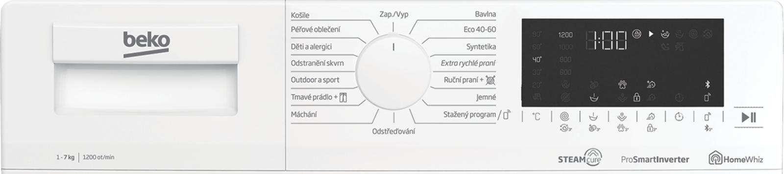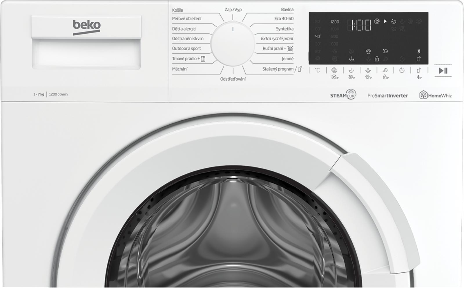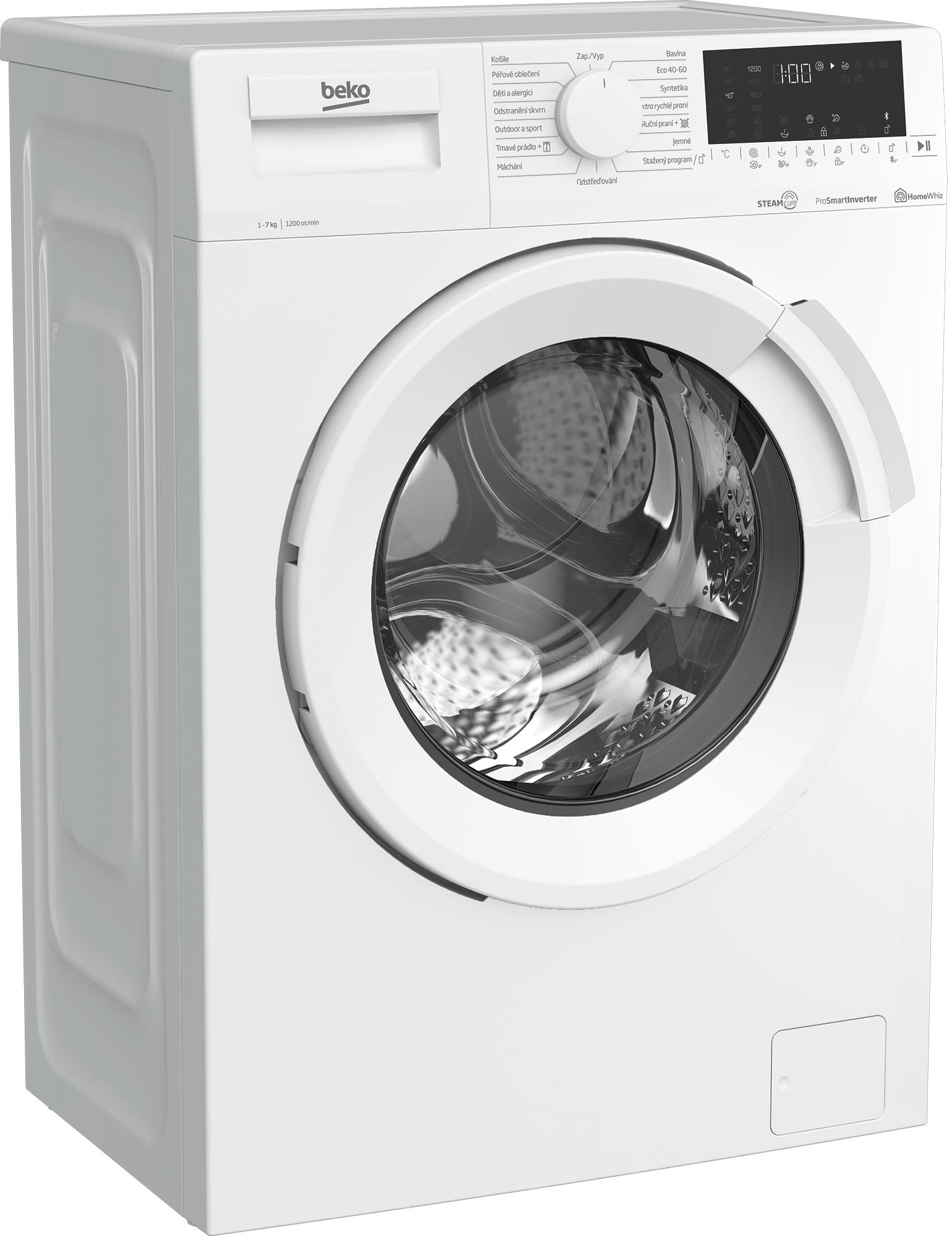 Úsporná automatická parní pračka Beko SteamCure s kapacitou 7 kg a možností stažení dalších programů. Pračka s párou SteamCure dokáže odstranit nejen ty nejodolnější skvrny, ale i bakterie a viry. Pára navíc zabraňuje pomačkání prádla, čímž usnadní žehlení. Buben AquaWave® se speciálním vzorkem se postará o šetrné praní a ProSmart™ invertorový motor zase o dlouhou životnost a spolehlivý provoz. Přes aplikaci HomeWhiz můžete vytvořit a stáhnout další prací programy a výhodou je také funkce Fast+ pro zkrácení délky praní.
