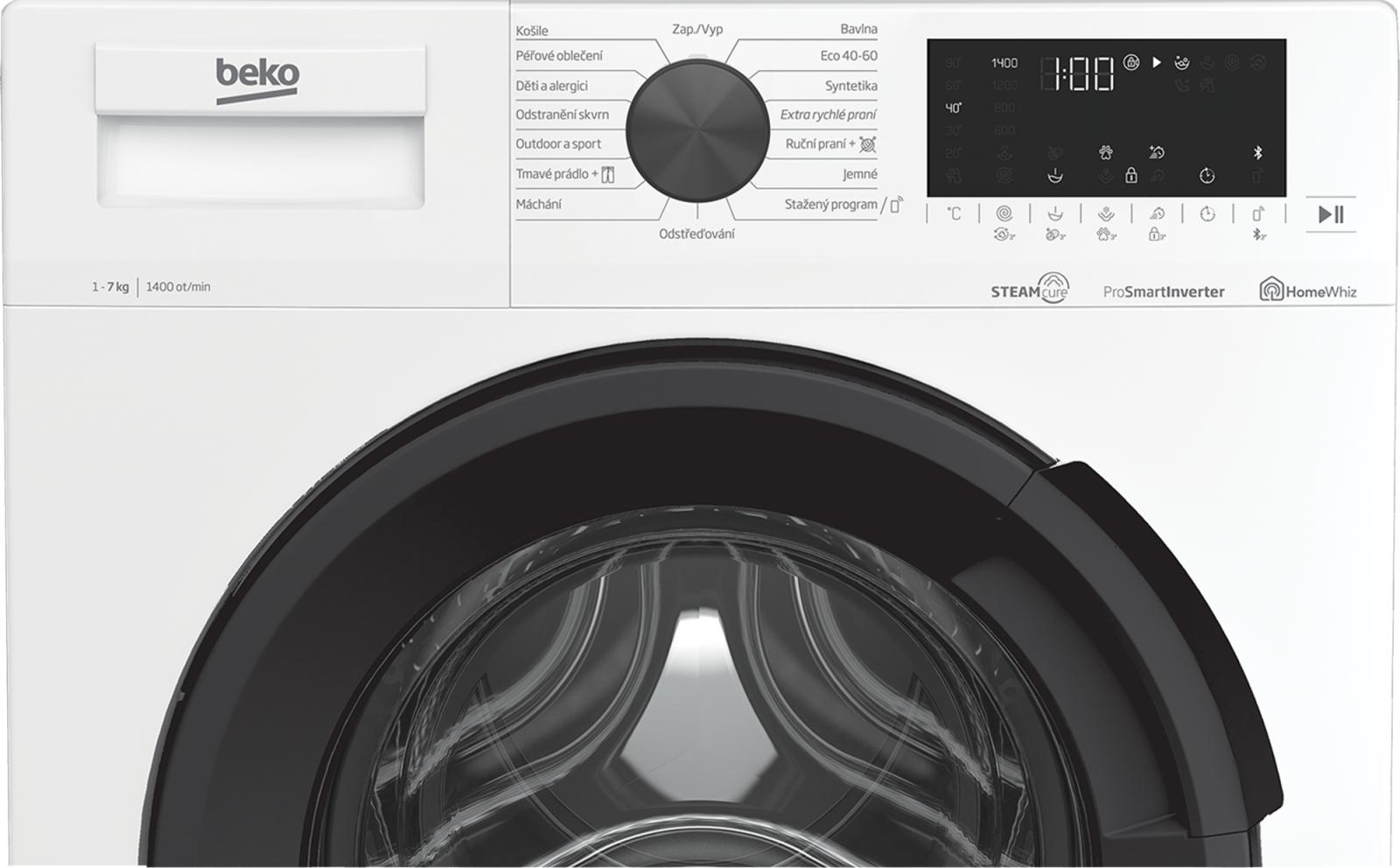 Úsporná automatická parní pračka Beko SteamCure s kapacitou 7 kg a možností stažení dalších programů. Úsporná pračka s párou SteamCure odstraní i odolné skvrny bez předpírání a usnadní vám žehlení. Umí vyprat plnou náplň prádla už za 28 minut, a dokonce šetrně díky speciálnímu vzorku bubnu AquaWave. Její ProSmart™ invertorový motor zajistí dlouhou životnost i spolehlivý provoz a výhodou je také aplikace HomeWhiz, která umožňuje nejen stažení dalších programů. Výhodou navíc je také funkce Fast+ pro zkrácení délky praní. 15 programů - Košile, Péřové oblečení, Hygiene+, Odstranění skvrn, Outdoor a sport, Tmavé prádlo a jeansy, Máchání, Odstřeďování, Stažený program, Jemné, Ruční praní a vlna, Extra rychlé praní Mini14, Syntetika, ECO 40-60, Bavlna