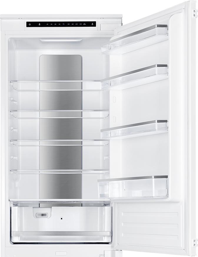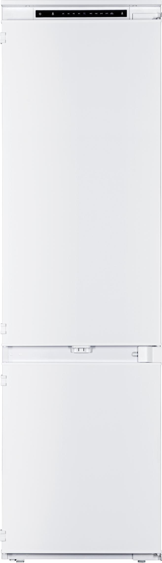 Kombinovaná vestavná chladnička s mrazákem dole; Systém Total No Frost; Bílé barevné provedení; Metal Cooling v barvě nerez; Celkový užitný objem: 270 l; Vnitřní LED osvětlení; Bíle podsvícené ovládací prvky; Způsob instalace nábytkových dvířek: Posuvné lišty; Možnost změny směru otevírání dveří; Invertorový kompresor; Klimatická třída SN, N, T; Energetická třída D; Roční spotřeba energie: 182 kWh; Hlučnost pouhých 37 dB(A); Délka přívodního kabelu 220 cm; Hmotnost: 56 kg; Rozměry (VxŠxH): 193,7 x 54 x 55 cm