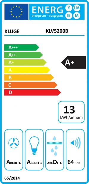 Plně vestavný odsavač par KLV5200B v černém matném provedení; Šířka 60 cm; Ovládání mechanickými tlačítky; 3 stupně intenzity odsávání; Osvětlení 1× LED pásek, 3 W; Výkon odtahu 255–402 m³/h; Hlučnost 52–64 dB(A); Tukový hliníkový filtr a volitelný uhlíkový filtr pro recirkulaci; Vestavná instalace do skříňky s horním odtahem o průměru 150 mm; Energetická třída A+; Roční spotřeba energie 13 kWh; Rozměry (V׊×H) 17,5 × 59,5 × 28,5 cm