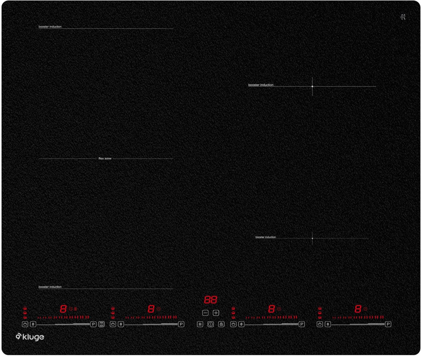 Indukční varná deska s šířkou 60 cm; Povrch z matného skla v černém provedení s červeným LED podsvícením; Dotykové ovládání Multi Slider Control; 9 stupňů nastavení výkonu; 4 nezávislé varné zóny: levá přední 190×190 mm / 1,5–1,8–2,0 kW, levá zadní 190×190 mm / 2,0–2,4–2,8 kW, pravá zadní 180 mm / 1,8–2,0–2,4 kW, pravá přední 160 mm / 1,2–1,3–1,5 kW; 5 funkcí vaření; Funkce Smart pause – snížení výkonu všech zapnutých zón; Detekce nádobí; Dětský zámek; Automatická ochrana vypnutí; Indikace zbytkového tepla; Časovač pro automatické vypnutí nebo použití jako minutka, max. 99 minut; Celkový příkon: 7,2 kW (power management 2,8 / 4,5 / 6,0 / 7,2 kW); Rozměry (V׊×H): 5,8 × 59 × 52 cm.