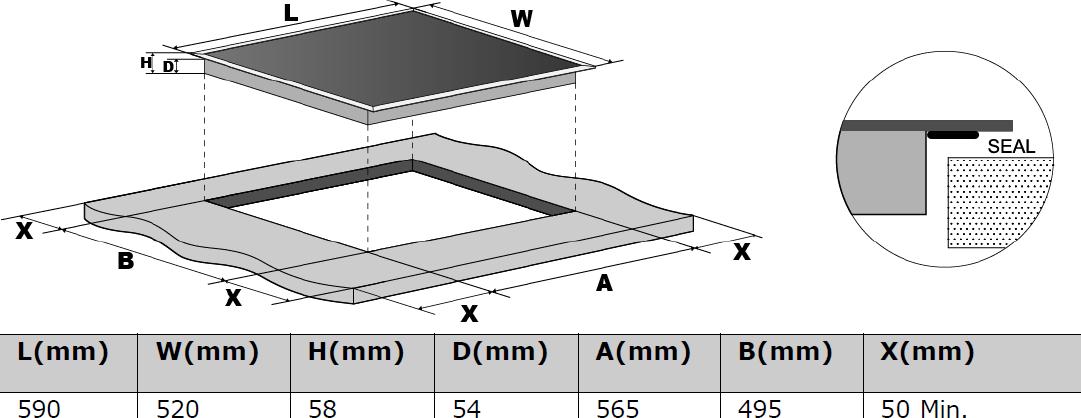 Rozměry otvoru pro vestavbu (V x Š x H): 56,5 x 49,5