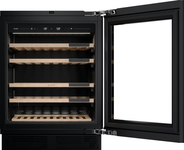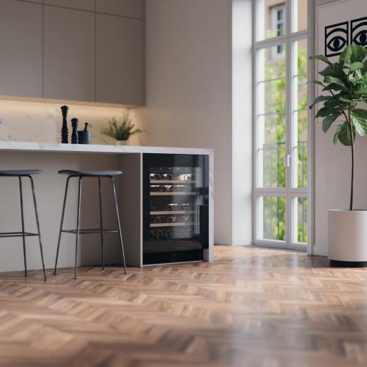 Vestavná vinotéka s jednou teplotní zónou pojme až 44 lahví vína (0,75 l), které bezpečně spočívají na dřevěných policích. Dvířka s mechanismem push-to-open jsou vybavena UV filtrem, který chrání víno před škodlivým zářením. K dispozici máte několik praktických funkcí a také přístup k rozsáhlé databázi Vivino prostřednictvím vašeho smartphonu nebo tabletu – díky tomu budete mít dokonalý přehled o své osobní sbírce.