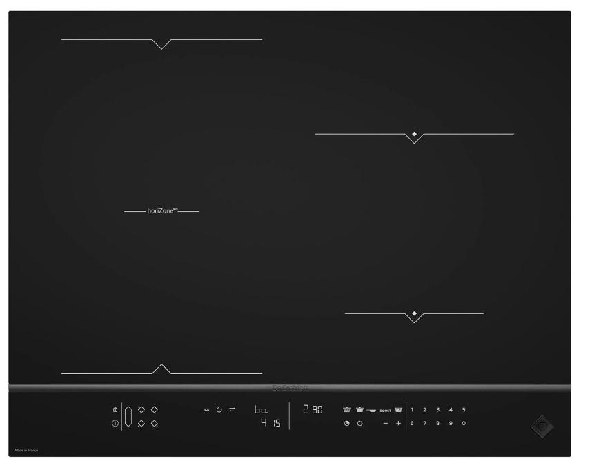 Indukční varná deska horiZone,65 cmširoká; Provedení černé sklo + černá přední dekorativní lišta; BílýLCD displej; Variabilní varnou plochu horiZone je možné použít celou, nebo ji rozdělit na 2 zóny; Automatická detekce velikosti a pozice nádoby s pamětí nastaveného výkonu a času; 20 stupňů nastavení výkonu; Funkce Boost a Časovač pro každou ze čtyř varných zón;Funkce:Boost, Boil (kontrola varu), Clean lock (dočasný zámek pro čištění), Automatic pan recognition (detekce nádoby), Recall (poslední nastavení), Switch (přemístění nádoby), Elapsed time (uplynulý čas), ICS (Inteligentní varný systém); 10 bezpečnostních prvků; Napájecí kabel je dodáván bez koncovky, délka 130 cm; Celkový příkonmax. 7400 W; Rozměry pro vestavbu: 56 x 49 cm;Rozměry(VxŠxH): 6 x 65 x 51,5 cm.