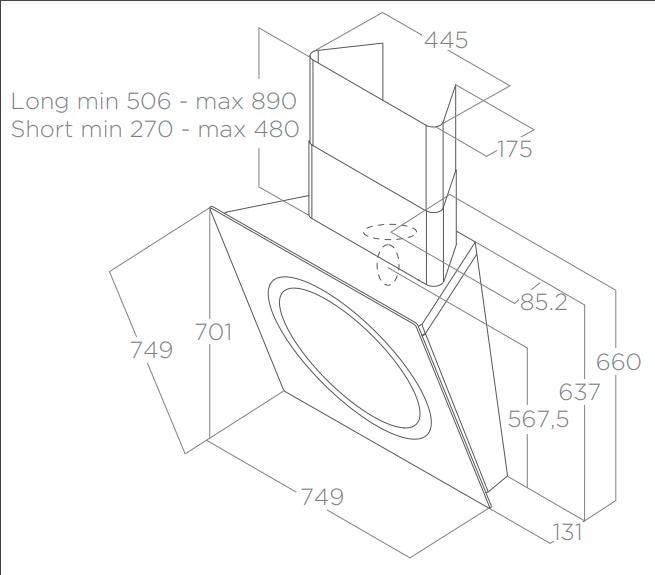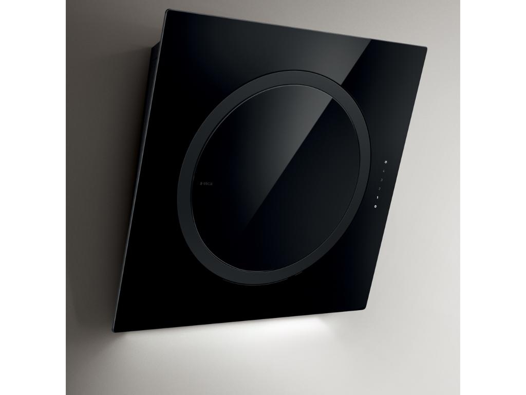 je komínový odsavač par (digestoř) z černého bezpečnostního skla s černým středovým kruhem, po zapnutí se středový kruh zasune dovnitř a umožní tak perimetrické sání. Odsavač par (digestoř) nabízí velký výkon od 230-510 m3/..