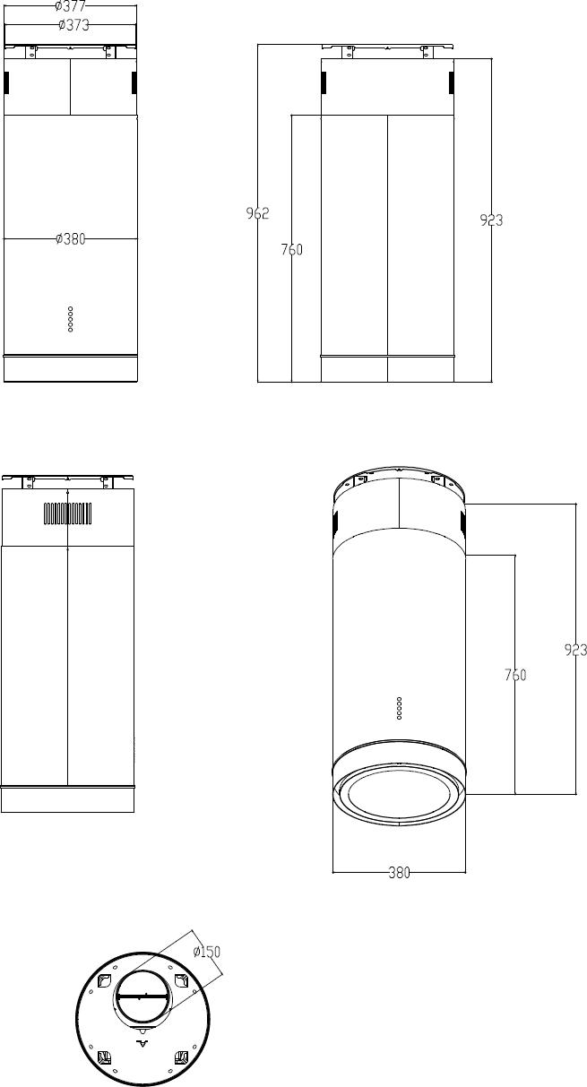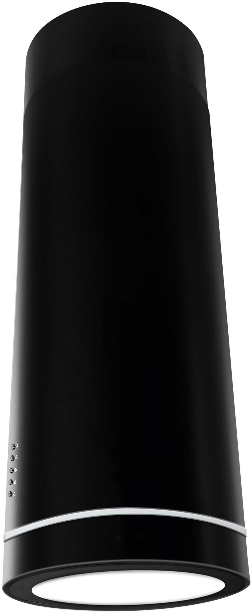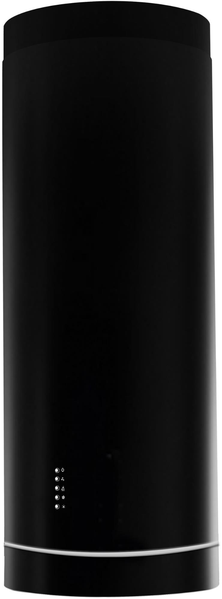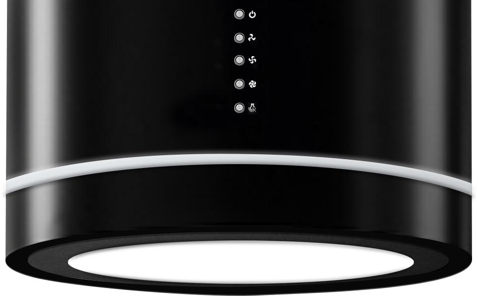 Ostrůvkový odsavač par o průměru 38 cm v černém barevném provedení kov; Ovládání je tlačítkové elektronické podsvícené; K dispozici jsou 3 stupně nastavení výkonu odsávání + Boost; Typ osvětlení je 7,5 W se spodním LED panelem a designovým světelným kroužkem 6 W; Světlo je možné upravit nastavením jasu, kde lze cyklicky přepínat mezi hodnotami 100%, 75% a 50%; Teplota světla je také nastavitelná, a to v šesti krocích od 3200K (teplá) po 6500K (studená); Výkon odtahu je 250,5 – 485 m³/h (544,9 m³/h v režimu Boost); Hlučnost dosahuje 49 – 64 dB(A) (67 dB(A) v režimu Boost); Uhlíkové filtry pro recirkulaci; Třída energetické účinnosti A; Roční spotřeba energie 29 kWh; Rozměry (VxŠxH): 92,3 – 96,2 x 38 x 38 cm