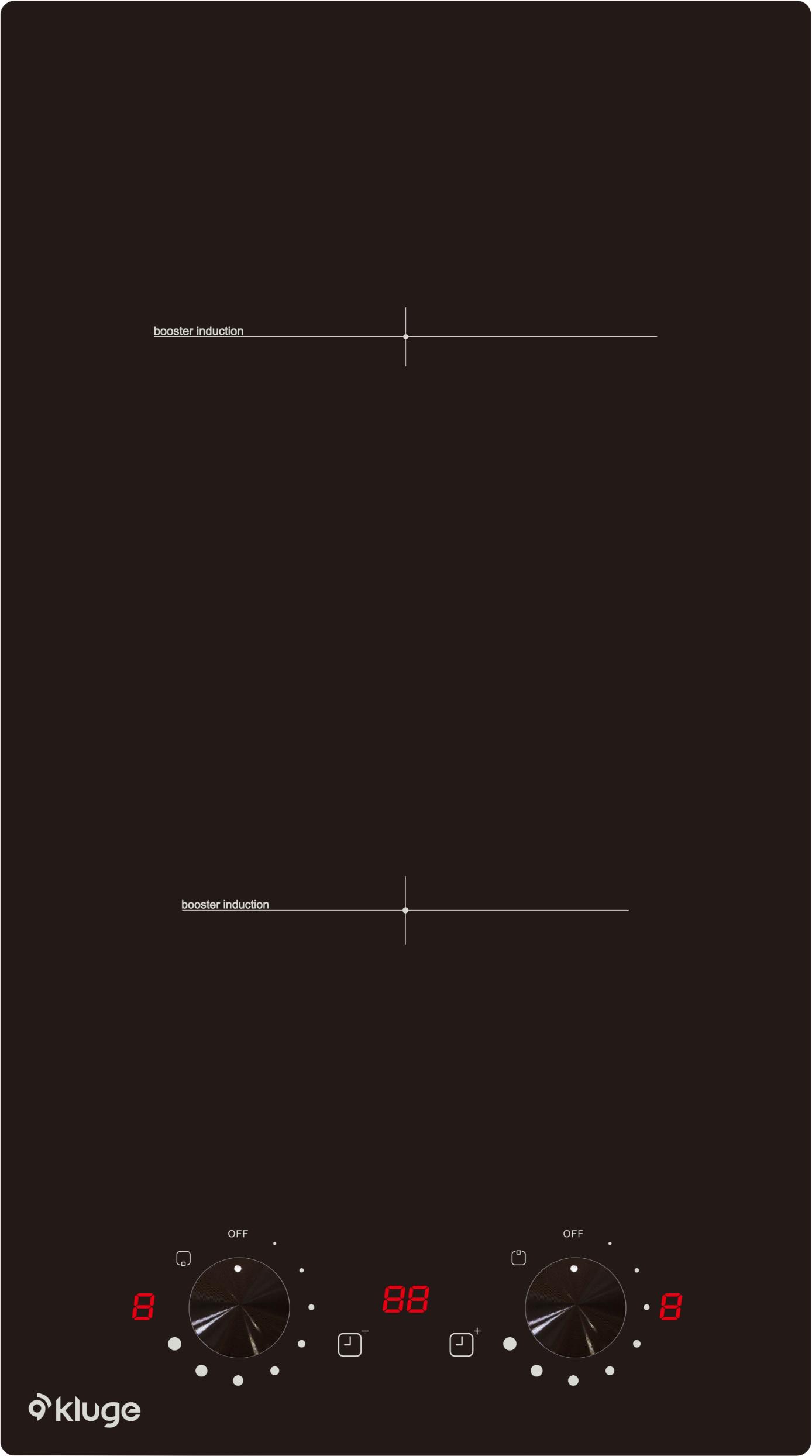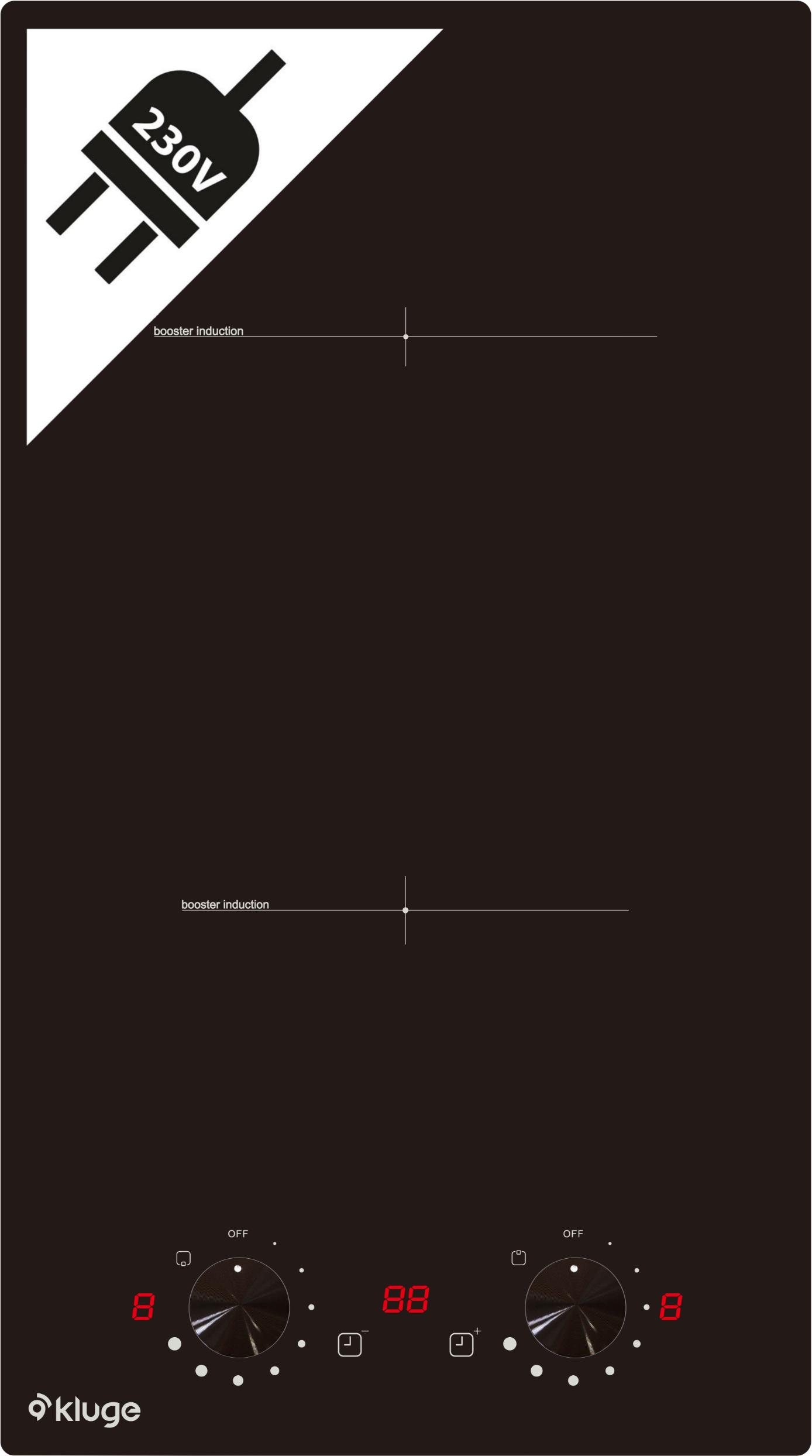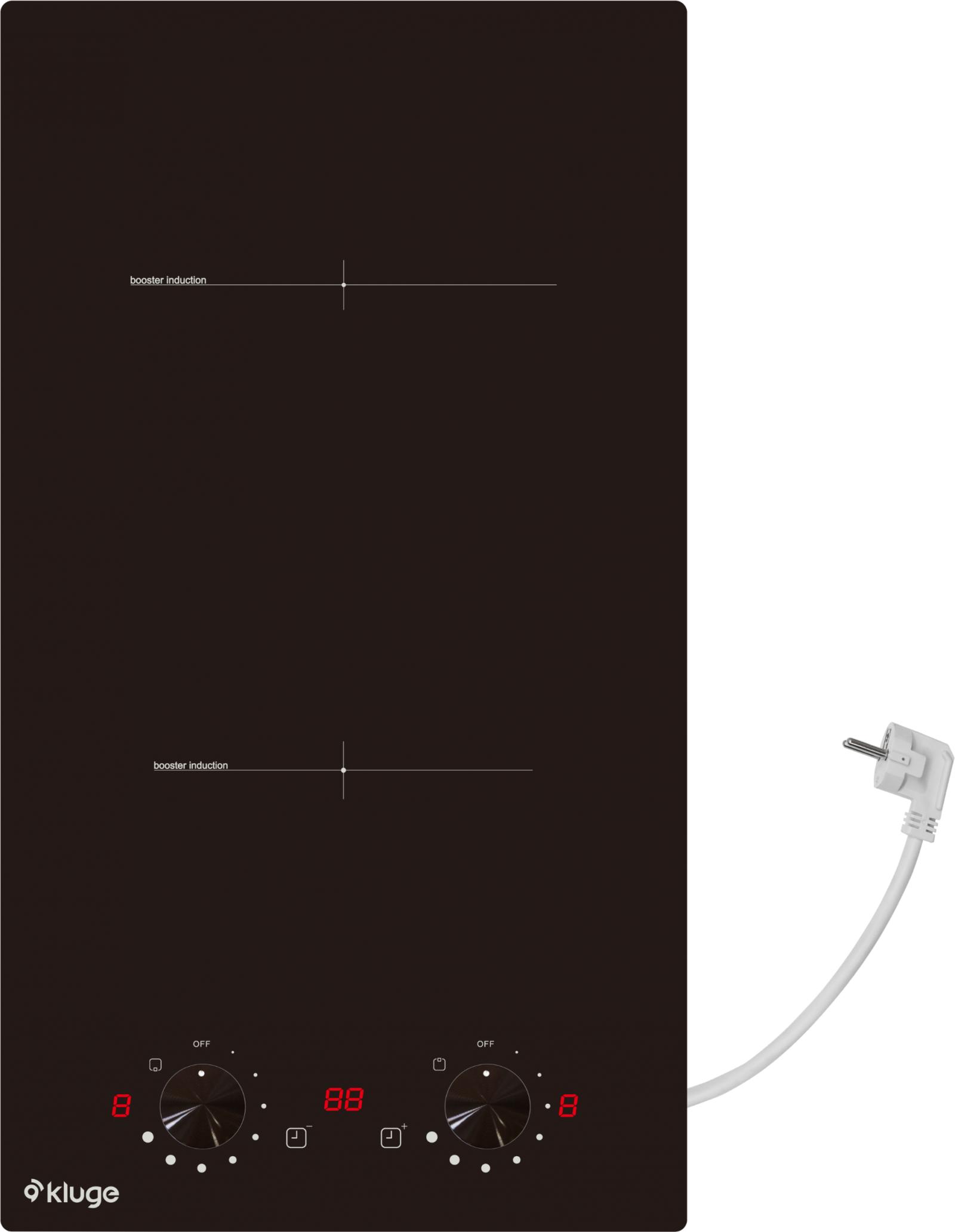 Indukční varná deska typu Domino 30 cm široká; Povrch z černého skla s s rovnými hranami; Ovládání pomocí otočných voličů; 8 stupňů nastavení výkonu; 2 varné zóny: 1 x 16 cm / 1,5 kW + 1 x 18 cm / 2,0 kW; Celkový příkon 3500 W; Detekce nádobí; Automatická ochrana vypnutím; Indikace zbytkového tepla; Časovač pro automatické vypnutí, nebo pro použití jako minutka; Připojení do zásuvky; Rozměry (VxŠxH): 58 x 29 x 52 cm