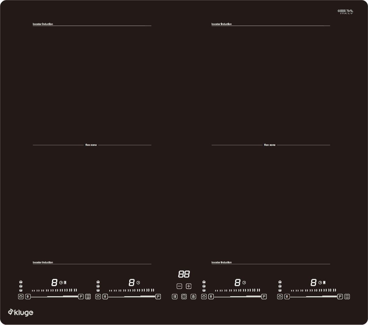 - 4 varné zóny: 2x 19x19 cm / 1,5 (1,8 Boost, 2,0 Power Boost) kW, 2x 19x19 cm / 2,0 (2,4 Boost, 2,8 Power Boost) kW