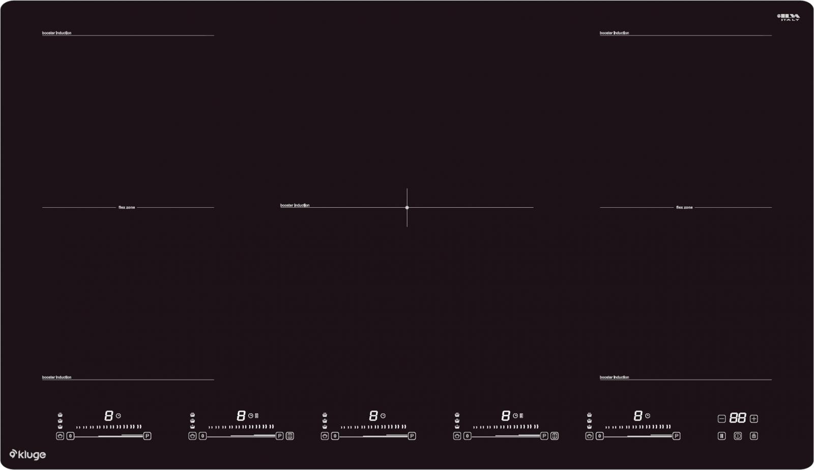 - 5 varných zón: levá přední 190×190 mm (1,5/1,8/2,0 kW), pravá přední 190×190 mm (1,5/1,8/2,0 kW), levá zadní 190×190 mm (2,0/2,4/2,8 kW), pravá zadní 190×190 mm (2,0/2,4/2,8 kW), střední 280 mm (2,3/3,0/3,3 kW)