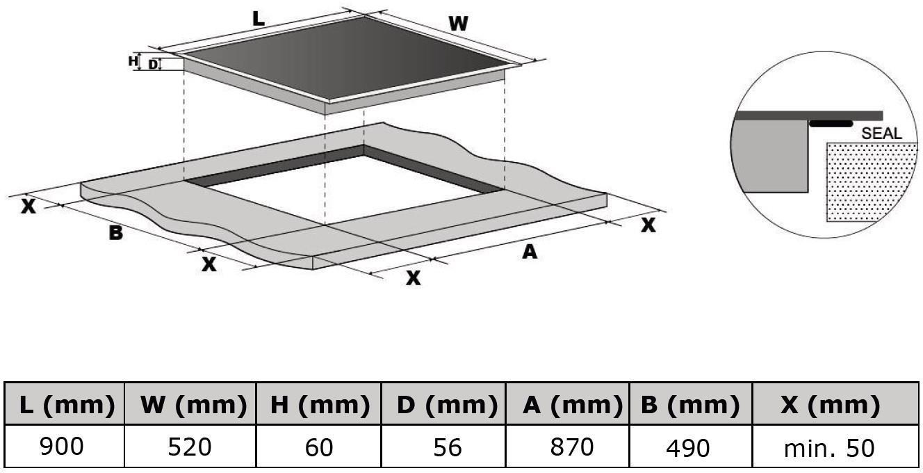 Indukční varná deska s šířkou 90 cm; Povrch z černého skla s bílým LED podsvícením; 5 varných zón: levá přední 190×190 mm (1,5/1,8/2,0 kW), pravá přední 190×190 mm (1,5/1,8/2,0 kW), levá zadní 190×190 mm (2,0/2,4/2,8 kW), pravá zadní 190×190 mm (2,0/2,4/2,8 kW), střední 280 mm (2,3/3,0/3,3 kW); 9 stupňů nastavení výkonu a 2× Flexi zóna; Dotykové ovládání Multi Slider Control; 5 funkcí vaření; Funkce Smart pause – snížení výkonu všech zapnutých zón; Detekce nádobí; Dětský zámek; Automatická ochrana vypnutí; Indikace zbytkového tepla; Časovač pro automatické vypnutí nebo použití jako minutka, max. 99 minut; Celkový příkon: 9,0 kW; Rozměry (V׊×H): 6 × 90 × 52 cm.