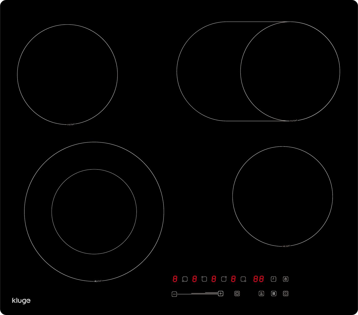 Sklokeramická varná deska s šířkou 60 cm; Povrch z černého skla s červeným LED podsvícením zajišťuje elegantní vzhled a dobrou přehlednost ovládacích prvků; Dotykové ovládání s plynulým posuvníkem výkonu umožňuje přesné a pohodlné nastavení výkonu; 9 stupňů nastavení výkonu poskytuje široký rozsah regulace pro různé způsoby přípravy pokrmů; 4 varné zóny: 2x 24 cm / 1,0 kW, 1x 18 cm / 1,2 kW a 1x 15 cm / 1,2 kW pokrývají potřeby běžného vaření; 1x oválná zóna a 1x duální zóna umožňují flexibilní použití nádob různých tvarů a velikostí; 3 úrovně udržování teploty pro rozpuštění, udržování v teple a pomalé mírné vaření; Funkce Smart pause umožňuje dočasné přerušení vaření a následné obnovení nastavení; Časovač s možností nastavení vypnutí až do 99 minut zvyšuje komfort obsluhy; Upozornění na zbytkové teplo a dětský zámek přispívají k bezpečnému provozu; Detekce nádobí a funkce bezpečnostního vypnutí chrání spotřebič i uživatele; Celkový příkon 7,15 kW; Rozměry (VxŠxH): 5,2 x 59 x 52 cm umožňují snadnou instalaci do standardního kuchyňského výřezu.