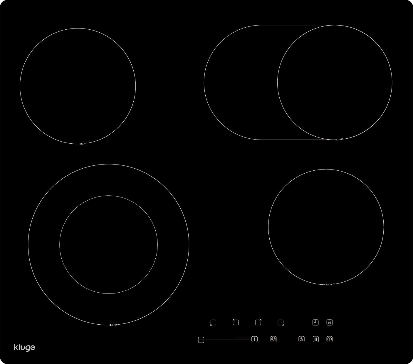 - 4 varné zóny: 2x 24 cm / 1,0 kW, 1x 18 cm / 1,2 kW, 1x 15 cm / 1,2 kW