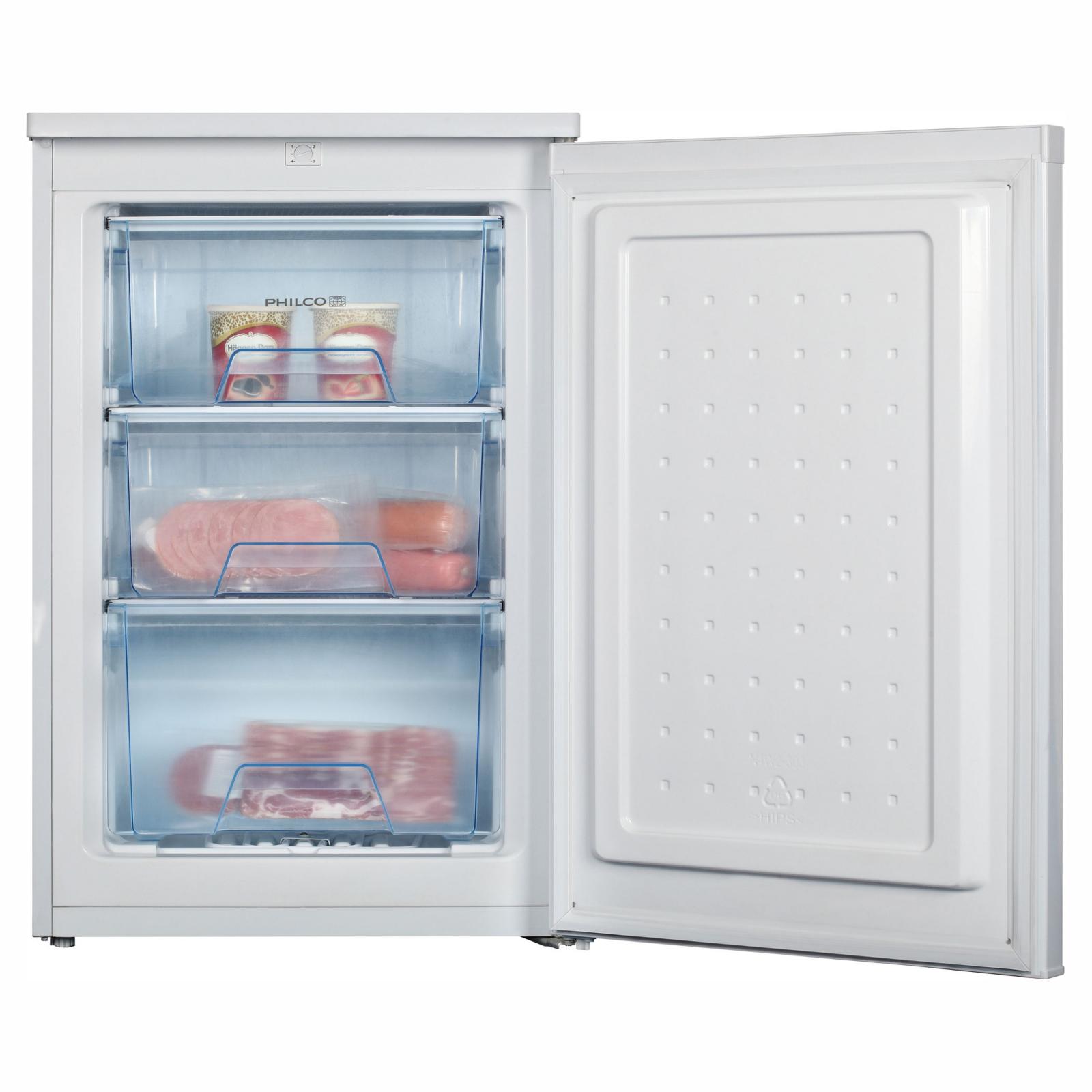 Jednodveřový šuplíkový mrazák Philco PTF 862 v energetické třídě E, pracující v tichém chodu při minimální hlučnosti 39 dB.